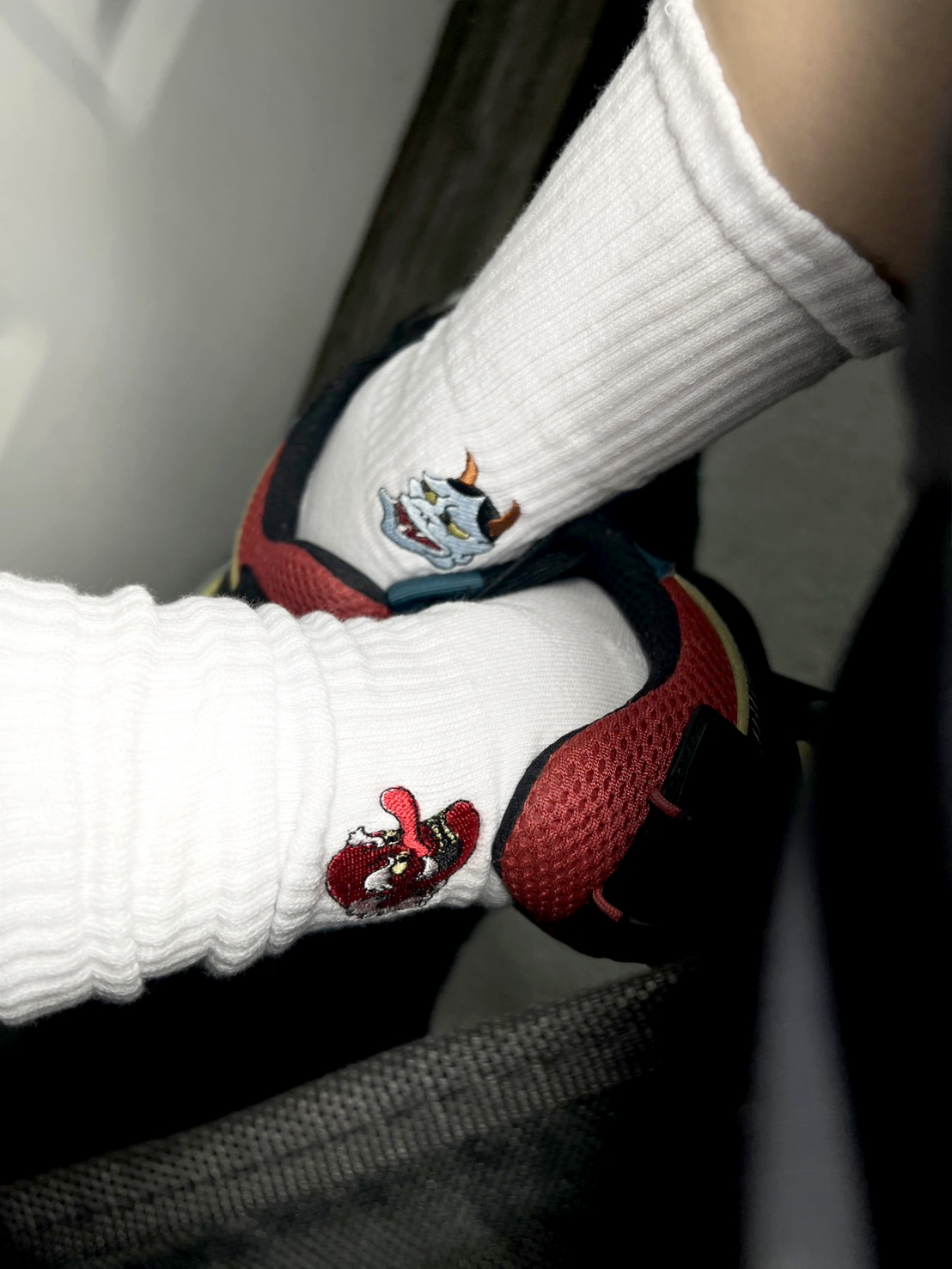 裂魂日系鬼面刺繡不對稱設計半毛巾底長襪【SCSXU16】