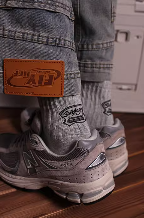 採用美式復古膠印風格字樣,搭配立體羅紋襪身設計,實穿又有細節。
